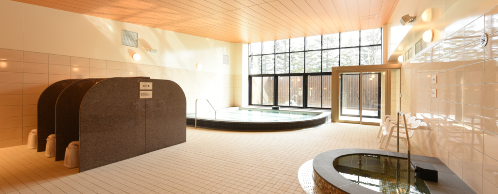 • 温泉・プール・ジムが一体となった複合施設。温水プールは屋内なので雨の日でも安心。