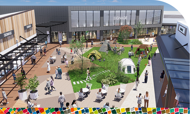 • ショップやカフェ、オフィスが集まった新しいライフスタイル施設。屋外広場には屋根があり、雨の日でも散策可能。